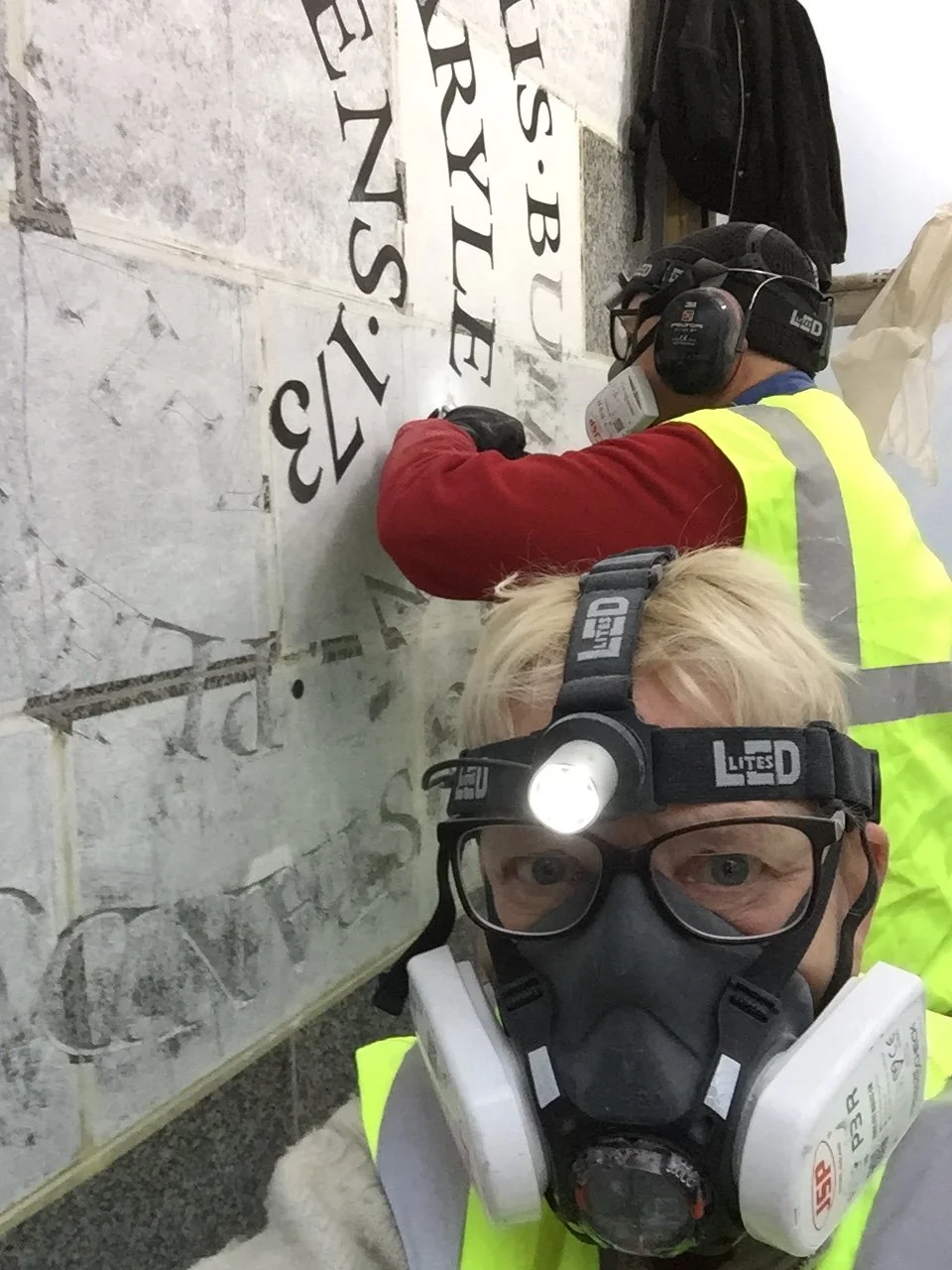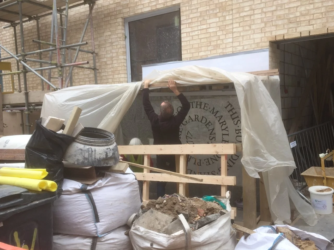 However before we could lay out the inscription we had to paint the very shiny wall with emulsion, and tape up the mortar so this would not get stained. To get the paint to dry on that cold November day took longer than transferring the drawing. Blow torches were used, and a dehumidifier. Whilst we waited Ben did a really good job making our plastic hut secure against the weather.