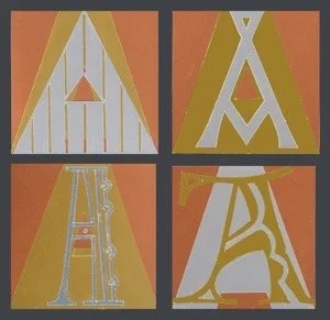 Cardboard maquettes for copper, aluminium and brass letters with assorted hardware, 100mm square. The metal letters are part of the frame of an information panel at Oldham Library.